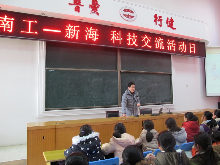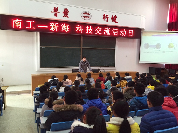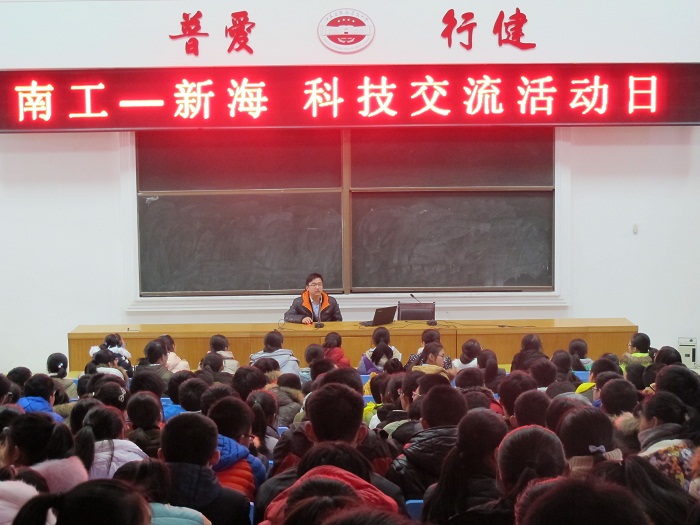 活动伊始,新海中学蒋捍副校长向我校许岩教授颁发聘书,聘请其作为新海化学俱乐部的专家顾问,并肯定了“南工-新海科技交流活动日”的创新意义,期望在两校生源合作的同时,依靠南工科技优势,加深与连云港地区各中学的科技交流合作,综合提升学生的实践能力。下午两点半,在新海体育艺术馆第一报告厅内,许岩教授为中学生们带来了题为《生活中化学》的科普知识讲座,他用生动的语言,精彩的例子,将同学们带入了化学美妙的世界。讲座也很好展示了我校优势学科的发展。报告厅内气氛热烈,同学们聚精会神,随后新海中学优秀毕业生,我校外语学院王裕颖、土木学院李树飞和中学生们进行了交流。在交流报告中,他们展现了丰富多彩的大学生活,自己成长发展的路径成果,也很好的展示了我校的学校品牌和学生发展平台。