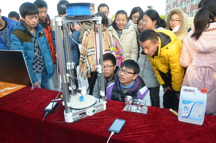 晖晖冬日暖,莘莘学子心。同时在新海中学的中心广场与主教学楼下,高中各年级的学科科技作品展台吸引了众多学生的兴趣。由校团委精心组织了多个南工科技社团,带着自己的科技作品和说明展板参与了科技交流展示。延续经典的斯特林发动机、天机遨游的六轴飞行器、循规蹈矩的循迹小车,鬼斧神工的3D打印,每一件学生自制的科技展品展品都吸引了众多同学的驻足观看,展台被好奇的中学生们围得里三层外三层。