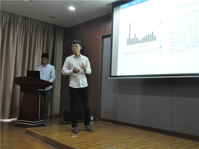 首先上场的是孙研同学和他的团队,他们本次参赛主题是抗冻ATY-1细胞固定化及其特性的研究,分别从课题背景、实验过程、实验结果、结论和展望四个方面展开介绍,并就评委的问题作出了精彩的回答。他们的应变能力赢得全场热烈的掌声。