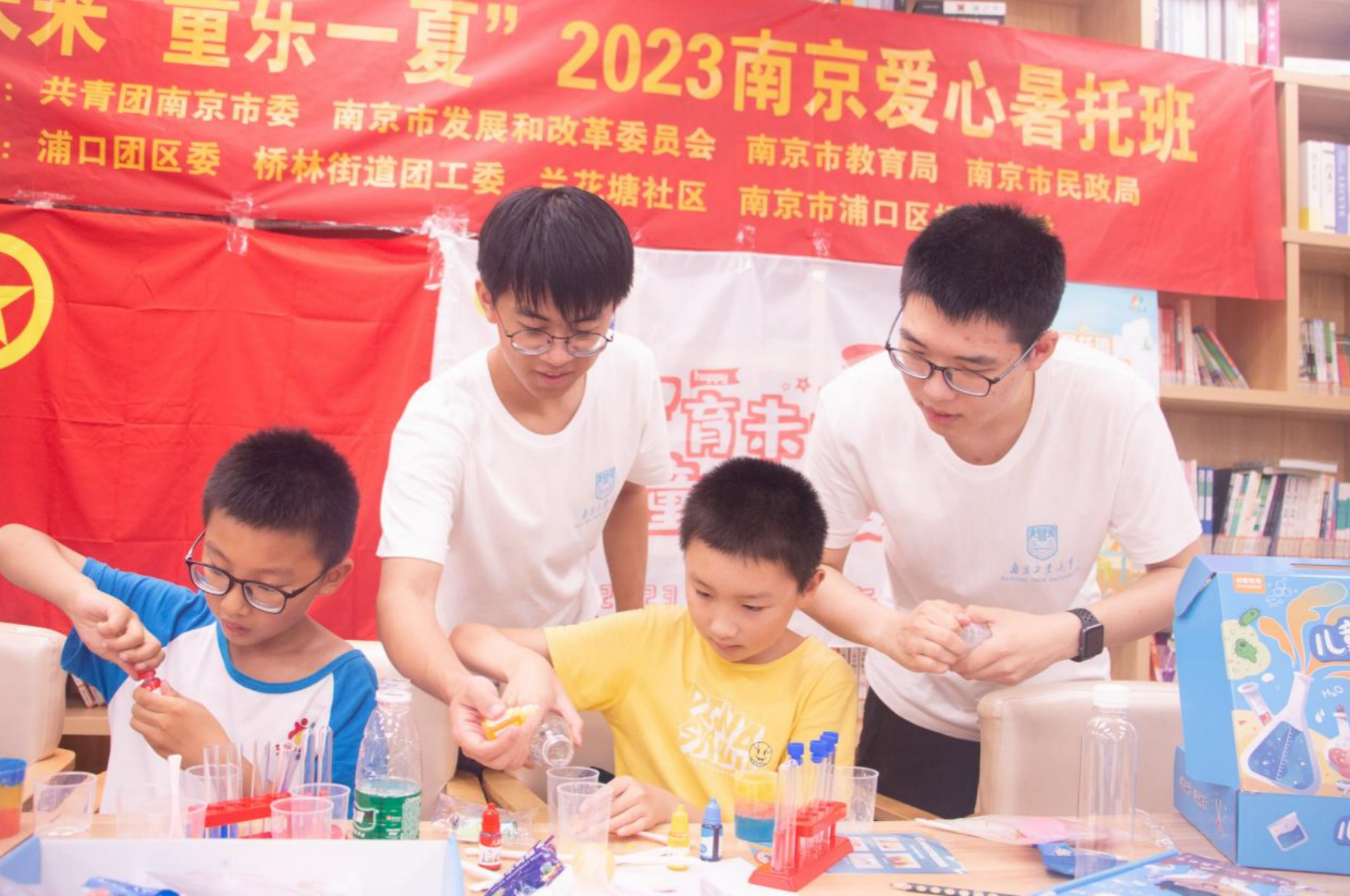 童心所“暑”育才团由生工学院团委选拔学院10名优秀在校生组建而成,自7月22日起分为两支队伍前往浦口区桥林街道和永宁街道参加开班仪式并正式入驻社区,重点面向街道6-14周岁“暑期看护难”的困境青少年、农村留守儿童等人群,提供为期一个多月的暑期看护志愿服务。团队成员精心设计了包含价值引领、心理疏导、生活指导、课业辅导等服务项目,同时团队成员结合万博体育bet 学科背景及专业特色,为孩子们带去“小小科学家”科普实验课程,用科学家精神滋养孩子们成长。爱心暑托班进展初期,团队成员细致入微的看护和倾心设计的精品科学课程,受到家长和小朋友们的一致好评,对后续志愿服务充满期待。