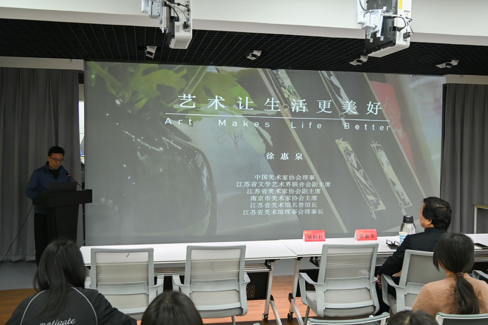 为了落实美育教育,贯彻“以美论心”的具体办法,提高学生的审美素养和水平,11月7日,校美育教育中心和艺术设计学院特邀中国美术家协会理事、江苏省美术家协会副主席、南京市美术家协会主席徐惠泉做题为“艺术让生活更美好”的艺术大讲堂。南京市美术家协会副秘书长刘杉杉,艺术设计学院党委副书记李有林,美育研究中心主任王志强出席本次活动,活动由艺术设计学院副院长吴海红主持。