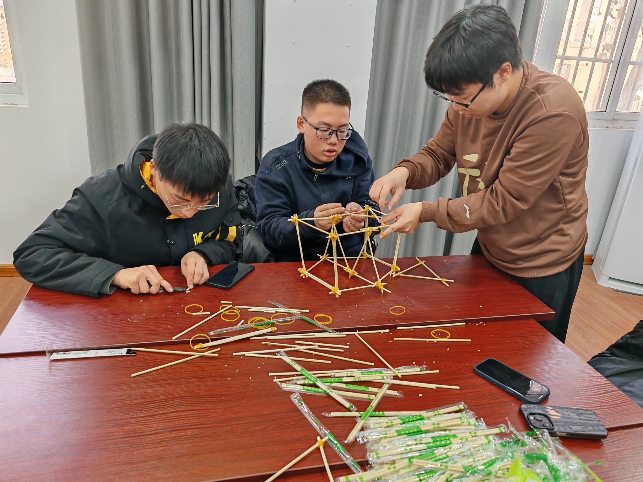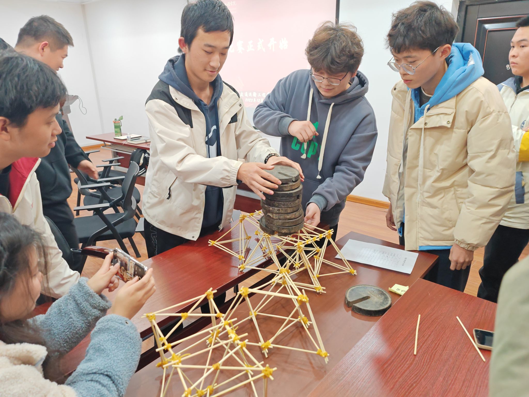 主持人介绍完各位评委和活动规则后,本次活动就在选手们的掌声中拉开帷幕。比赛限时两小时,在紧张的制作环节,各队成员积极交流,分工明确,配合默契,在不断的尝试与调整中展示踏实的作风,在激烈的讨论中将活动气氛推向高潮。最后,在令人屏气敛息的承重测试环中,“你说的都队”以35双筷子、承重27.5千克的成绩领先,获得一等奖。赛后,三位评委对本次活动做出总结,并和参赛选手们分享了自己的看法与经验。工作人员为获奖小队颁发奖状与奖品。