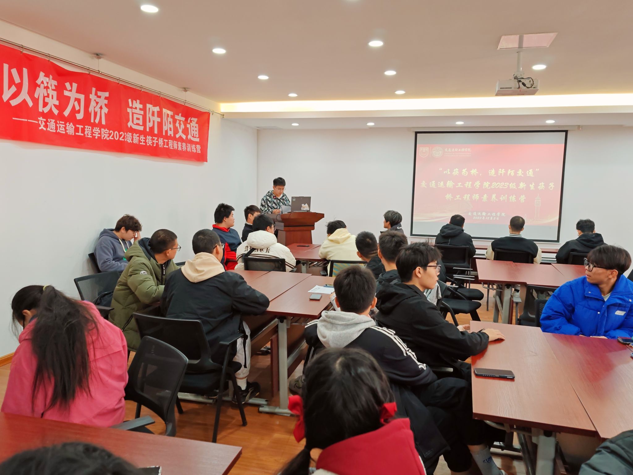 为了深入贯彻党的二十大精神,引导学生将所学运用于实际,营造浓厚的校园科创氛围,交通运输工程学院于2023年12月2日下午在天工楼举办“以筷为桥,造阡陌交通”交通运输工程学院2023级新生筷子桥工程师素养训练营活动。本次活动由我院学生会科创学习部主持,共有7支队伍参与其中,三位2020级的优秀学长受邀担任评委。