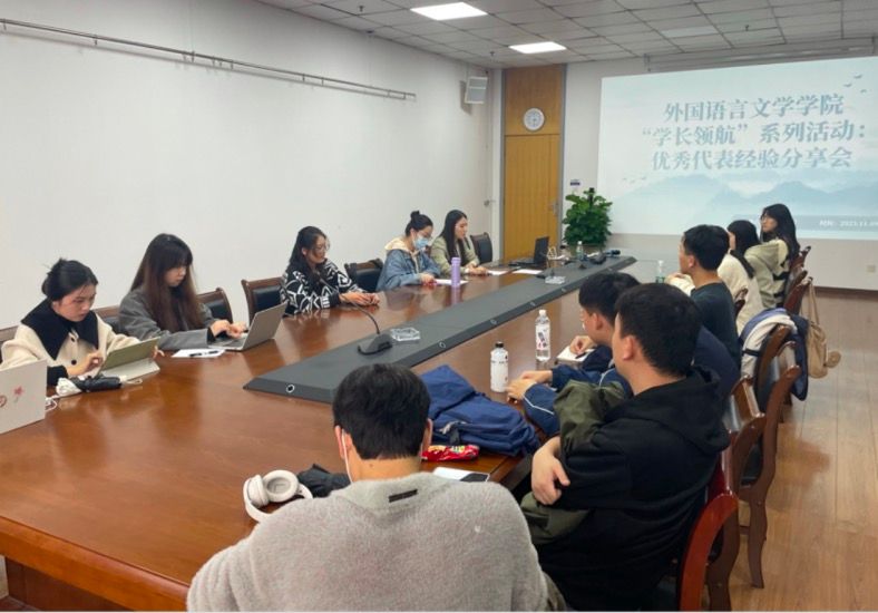 11月9日下午,外国语言文学学院在外语中心707举办“学长领航”优秀代表经验分享会。本次活动邀请2023年度“国家奖学金获得者”陈悦、学院研会执行主席王钰棨和2023届优秀毕业生代表杨婕主讲,学院全体2023级研究生及研会代表参加,活动由研究生辅导员贾琼主持。
