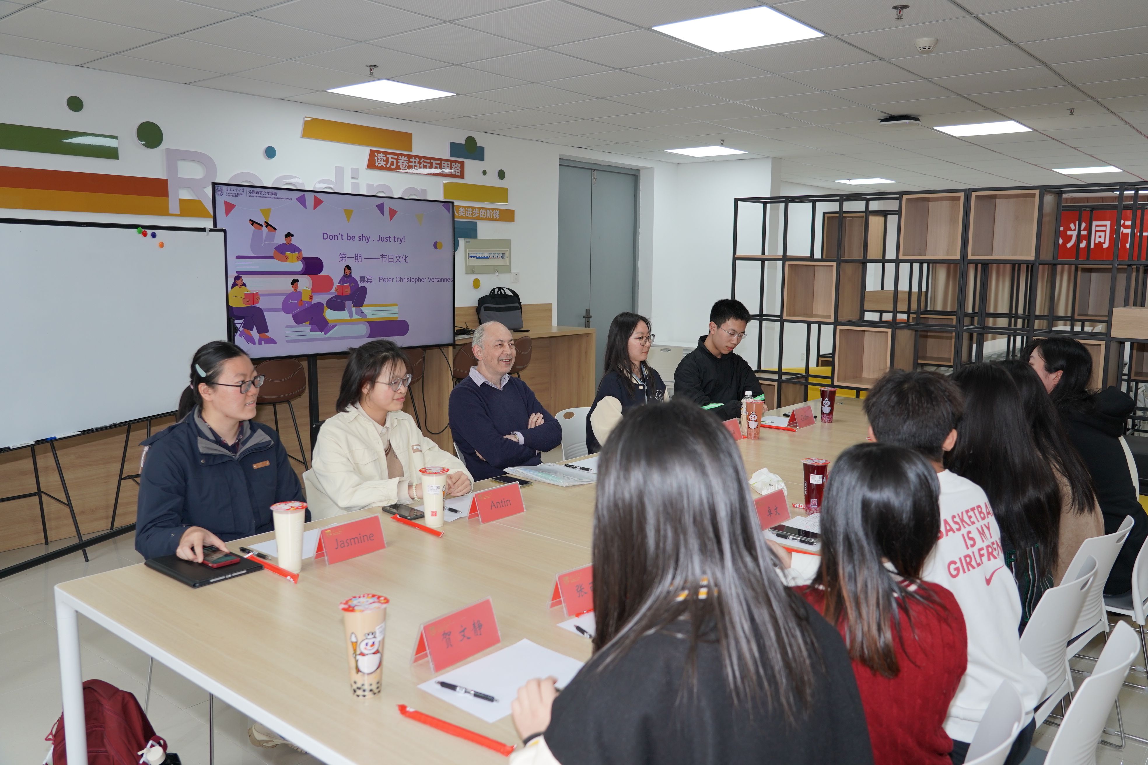 为提升学生的口语表达能力,调动学生的语言学习热情,4月10日下午1点,外国语言文学学院在南苑12栋“一站式”社区举办第一期“节日文化”主题外语角活动,本次活动邀请英语专业外教Peter Christopher Vertannes作嘉宾,共11位学生报名参与。
