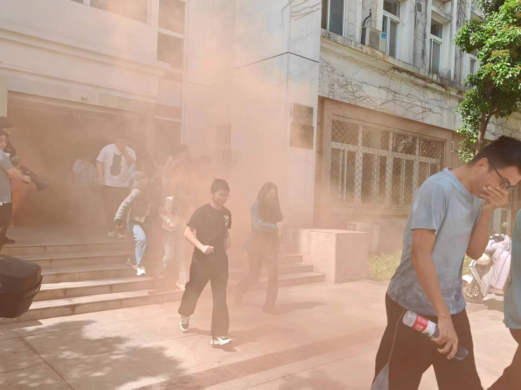 首先开展消防应急疏散,下午2点,沉北一楼门口涌起浓烟,广场响起紧急疏散信号,同学们采取弯腰低姿姿态(防止烟雾吸入)、用湿毛巾或手掌掩住口鼻、有序地按照疏散路线疏散至沉毅楼前广场。疏散后的同学在沉毅广场集合,由保卫处张望老师点评疏散过程中存在的问题,并为大家讲解了火灾烟雾的危害、应急疏散正确的姿态和注意事项。