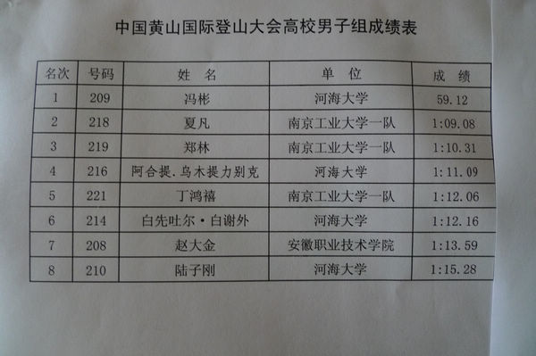 由国家体育总局登山运动管理中心、中国登山协会、安徽省体育局和黄山市人民政府主办,黄山风景区管委会、市委宣传部、市体育局、黄山旅游发展股份有限公司承办,安徽省体育彩票管理中心、泉州天伦天户外运动、中华户外网协办的2011年全国群众登山健身大会暨第七届中国黄山国际登山大会于11月14日上午在黄山风景区举行了开幕式,并进行了登山比赛。 第七届中国黄山国际登山大会是一次高规格的国际户外运动盛会。在历届黄山登山大会活动中,本届黄山国际登山大会人数最多、规模最大、参赛国家最多,有来自美国、英国、法国、韩国、俄罗斯、尼日利亚等52个国家200多名国外登山爱好者及来自国内10多个省市和7所高校的百余支代表队,共1000多名登山运动爱好者参加。登山线路从黄山风景区南大门出发,途经慈光阁,终点在玉屏楼,全长约12公里。比赛设:国内青年男、女组,中老年男、女组,高校男、女组,国外男、女组进行,各组分别取前八名,国内青年组、中老年组、高校组设团体奖,分别取团体前六名。 校大学生田径队在教练李海兵、张铭、王浩等老师率领下参加了本次登山比赛,最终取得了优异的成绩,其中女队队员杭兰旅、李晓和张菲菲同学分别获高校组女子第一、第三和第四名, 男队队员夏凡、郑林、丁鸿禧、王翔飞、茅伟分别获高校男子组第二、第三、第五第十四、第十七名,同时校田径队荣获高校组女子团体总分第一名、男女团体总分第二名,学校还获得了优秀组织奖。校田径运动健儿在比赛过程中所表现出来的那种“勇于争先、坚持不懈、顽强拼搏精神”给组委会和参加比赛的兄弟学校同仁及广大登山爱好者留下了深刻印象,充分地展示了南工大学子的风采。(来自体育部)