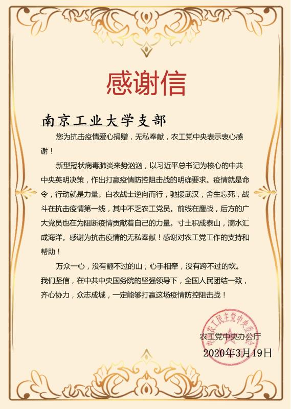 农工党中央办公厅在感谢信中表示,新型冠状病毒肺炎来势汹汹,以习近平总书记为核心的中共中央作出打赢疫情防控阻击战的明确要求之际,农工党南工大支部全体党员响应号召,积极行动,为抗击疫情贡献力量。