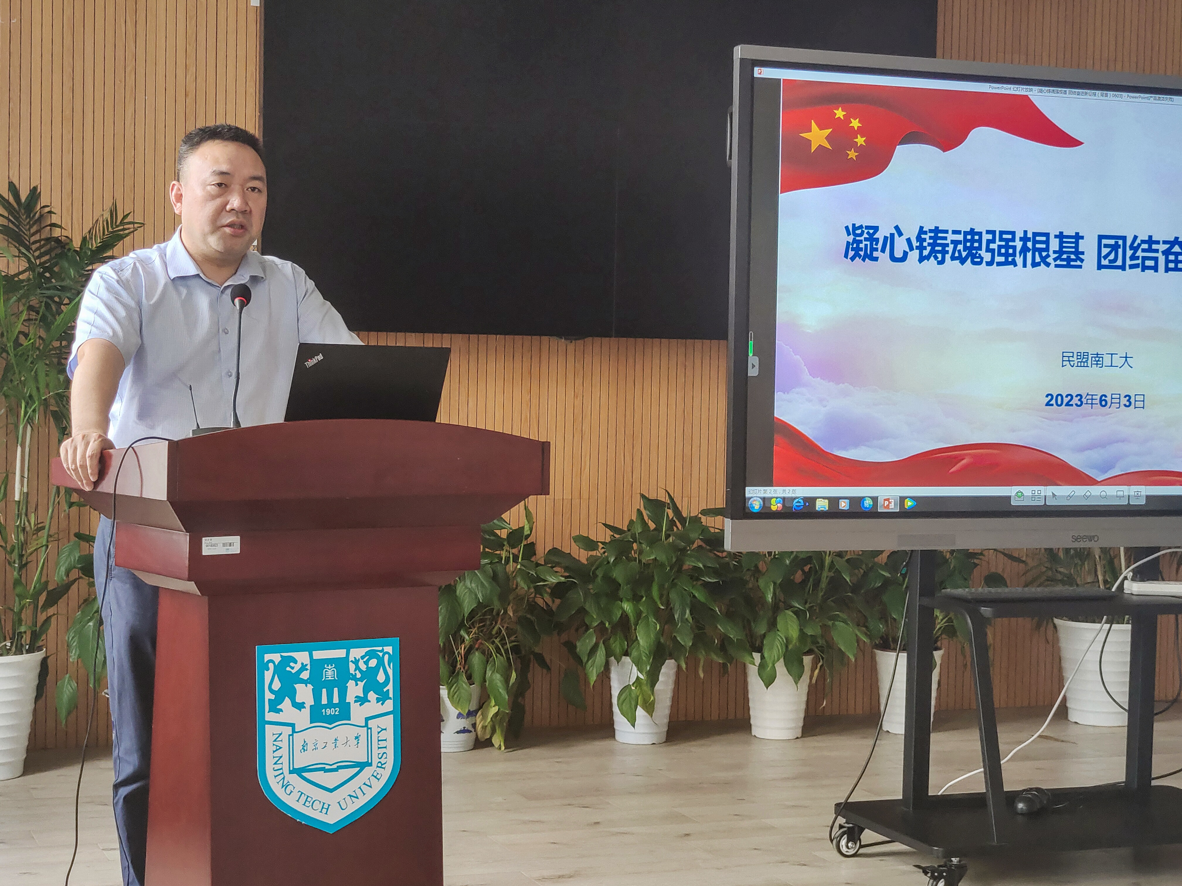 6月3日下午,民盟万博体育bet 委员会在同心家园开展“凝心铸魂强根基·团结奋进新征程”主题教育。校党委常委、统战部部长黄锁明出席,30余名盟员参加了本次学习。