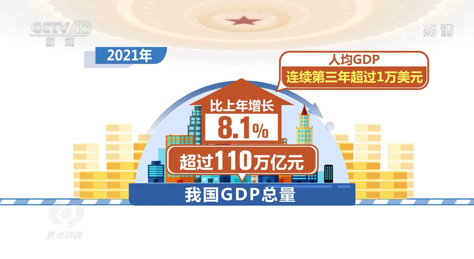 2021年,以习近平同志为核心的党中央团结带领人民,沉着应对百年变局与世纪疫情,实现了“十四五”良好开局。我国GDP总量超过110万亿元,比上年增长8.1%,人均GDP连续第三年超过1万美元。