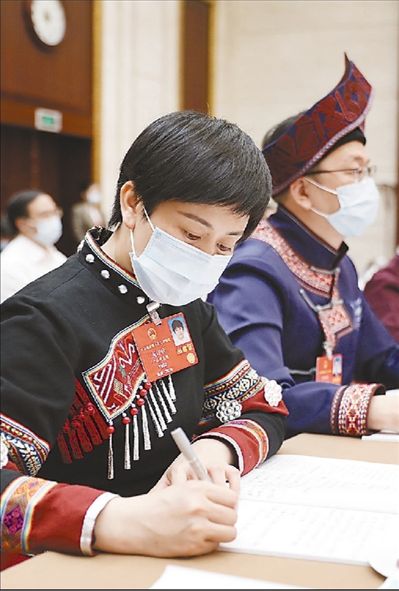5月22日下午,广西代表团举行全体会议,一位代表在认真记录。记者 林渊摄