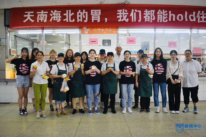 外国语言文学学院郭梦诗老师与学生代表一起前往东苑食堂,先后来到洗菜间、切菜间、后厨、餐具回收点等处,实地体验食堂工作人员的工作环境,并向工作人员送上生活用品和水果,感谢他们坚守在保障学生健康成长的第一线。
