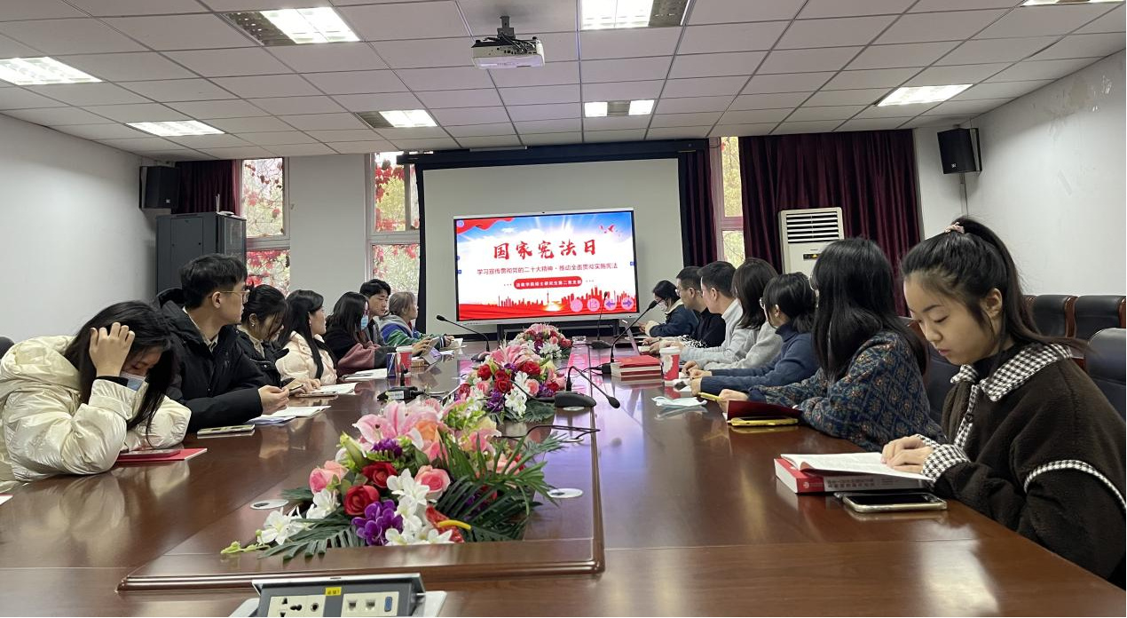 法政学院硕士研究生第二党支部召开宪法周专项学习会。此次学习由党支部书记杨孟主持,会上共同学习了宪法的地位、宪法日的设立及历年主题、公民的基本权利及义务、二十大会议上关于宪法精神的传达等内容。会上指出宪法是国家的根本法,是治国安邦的总章程,是党和人民意志的集中体现,同学们必须学习宪法、尊崇宪法。与会党员表示要通过此次学习,提高政治站位,从自身做起,依据支部专业特点优势丰富宣传载体,加大宪法学习宣传力度,营造浓厚的法治氛围,切实把宪法的规定、原则和精神落到实处。