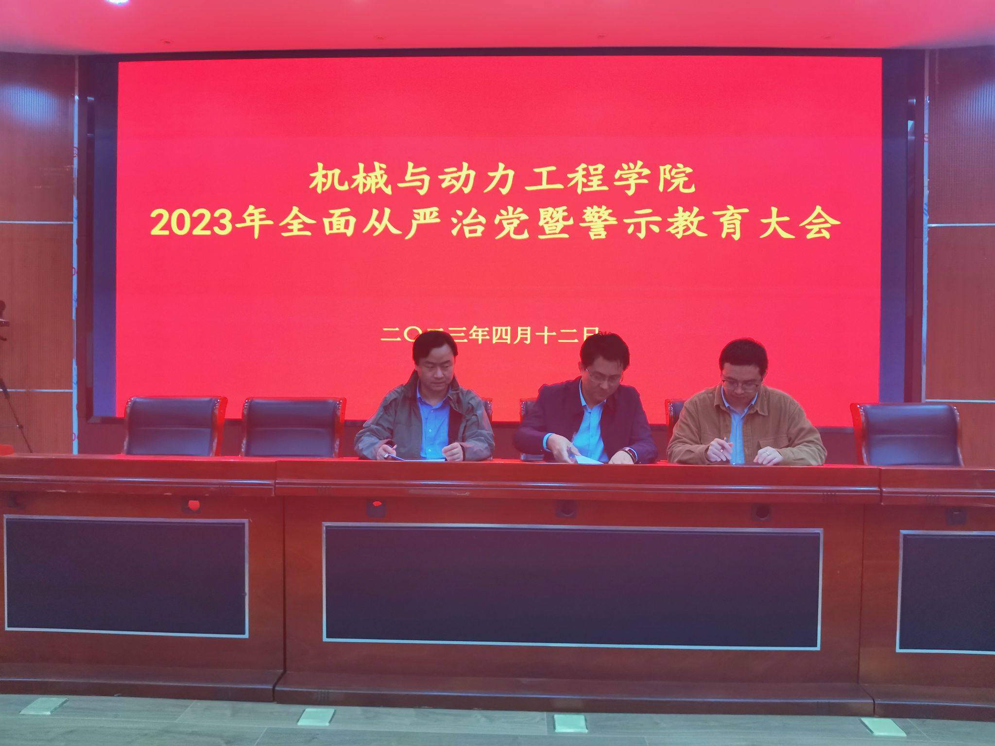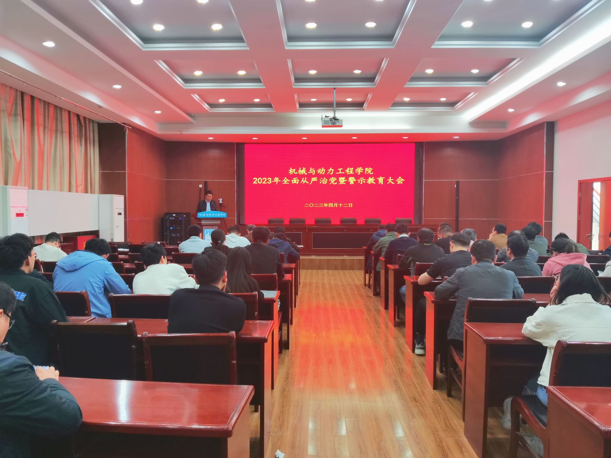 4月12日下午,机械与动力工程学院在崇德楼E楼四楼报告厅举行2023年全面从严治党暨警示教育大会。学院党政领导班子成员、基层各党支部支委、各二级单位负责人、全体辅导员和有重大在研科研项目或课题的负责人参加会议,会议由学院党委副书记付昌义主持。