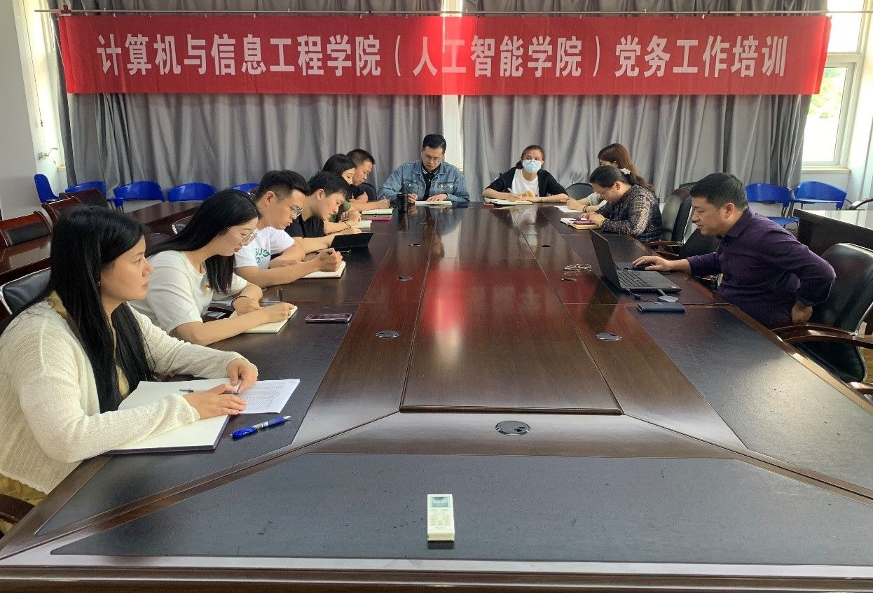 为深入开展学习贯彻习近平新时代中国特色社会主义思想主题教育,进一步推进学院学生党建工作,切实发挥好学生党建在学院人才培养中的引领作用,6月2日下午,计算机与信息工程学院(人工智能学院)党委开展了学生党建工作实务培训。学院党委负责人、各学生党支部书记、党委专职组织员等参加培训会。