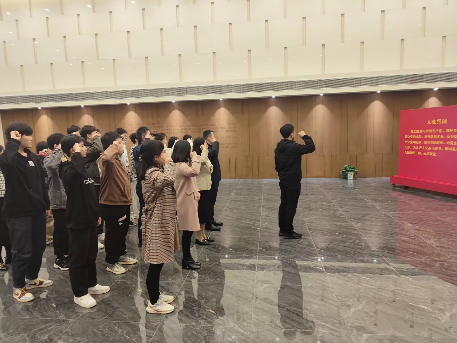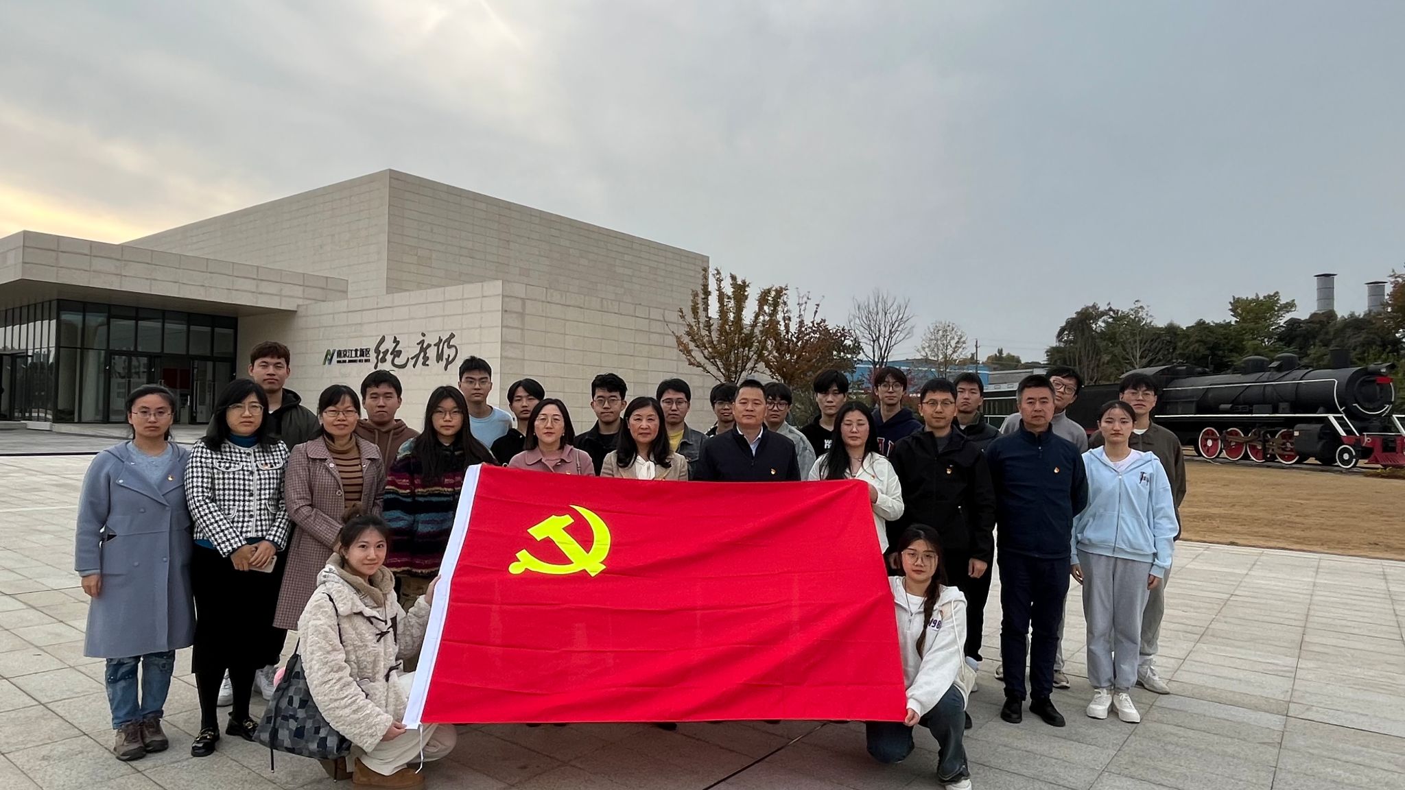 走进红色广场,草坪上1:1比例复原的中国自主设计制造的第一辆客运蒸汽火车模型给大家带来了极大的震撼;在红色文化展陈馆革命志士群体雕像前,师生党员面对鲜红的党旗,重温入党誓词、重忆入党初心。