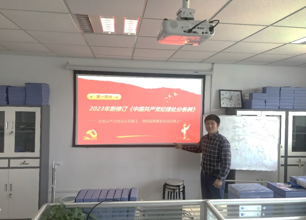 活动中,刘望舒书记首先就“学习贯彻新修订《中国共产党纪律处分条例》”这一主题进行了深入的专题报告。他在传达学校和学院党委关于党纪学习教育会议精神基础上,详细回顾了《条例》的五次修订历程,深入剖析了《条例》修订的三项重要意义,并对本次《条例》修订的亮点进行了全面解读。